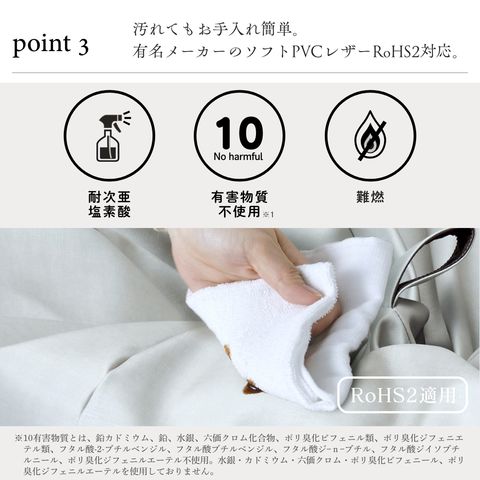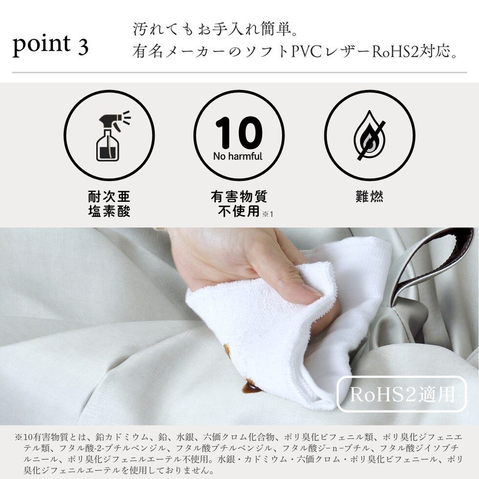 ■お洗濯不可です。汚れた場合は中性洗剤などを浸した布などで拭いたあと、乾いた布でしっかり拭き取ってください。ノロウィルス等ウィルス除去に必要な次亜塩素酸の希釈液にも対応したレザーですので、とても衛生的です。