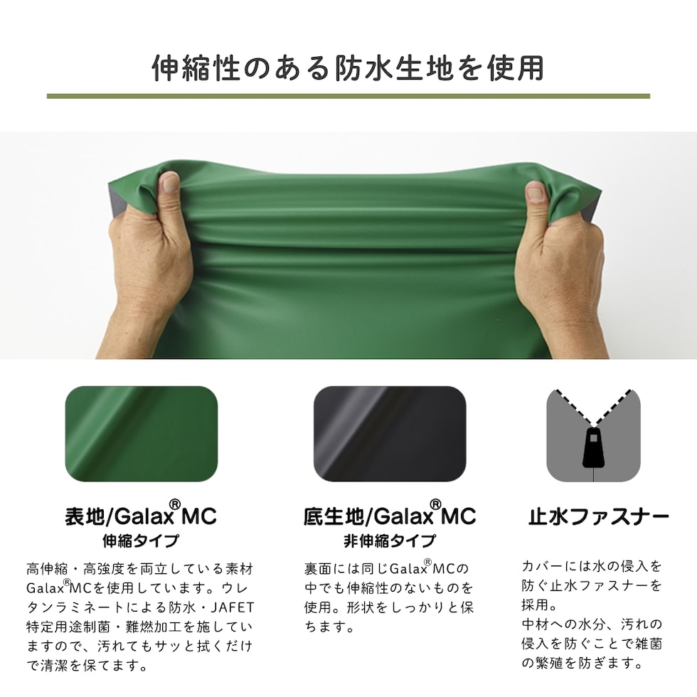 カバーの素材は、防水性と伸縮性に優れた素材Galax? MCを使用。制菌性にも優れ、止水ファスナーを採用しているので感染予防にも対応します。
