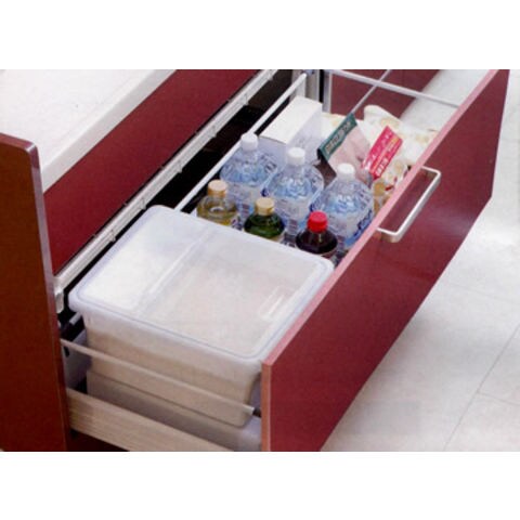 上からお米を取り出すタイプの米びつなので、システムキッチンの引き出しに収納してお使いいただけます。