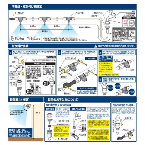 スペックセット内容:蛇口ニップル×1 コネクター×1 ホース×1 ホースエンド×1 ノズル×3 ナイロンクリップ×5 取付ネジ×6