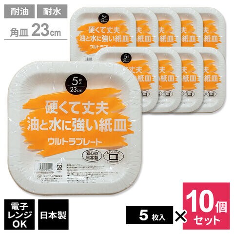 紙皿 ウルトラプレート 硬くて丈夫 油と水に強い紙皿 角皿23cm 5枚入 ×10袋セット U-9SQL | 使い捨て 食器 耐水 容器 耐油 皿 電子レンジOK 日本製 簡易食器 アウトドア レジャー バーベキュー 防災 備え 行楽 バザー