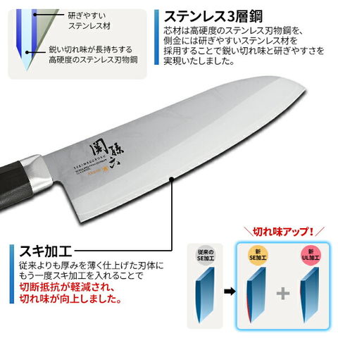 食材への切断抵抗を小さくする「スキ加工」と「三段階研削加工」により、食材への切り込みが良く鋭い切れ味。