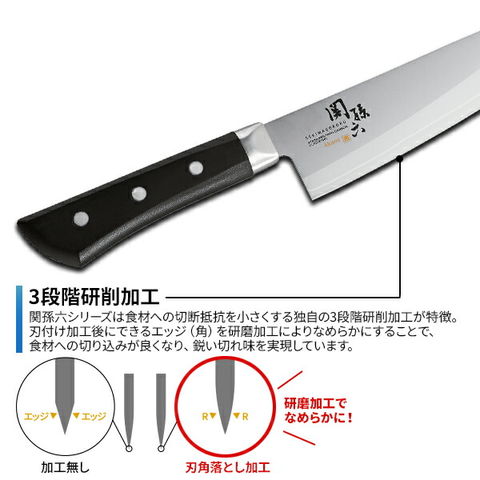 食材への切断抵抗を小さくする「スキ加工」と「三段階研削加工」により、食材への切り込みが良く鋭い切れ味。