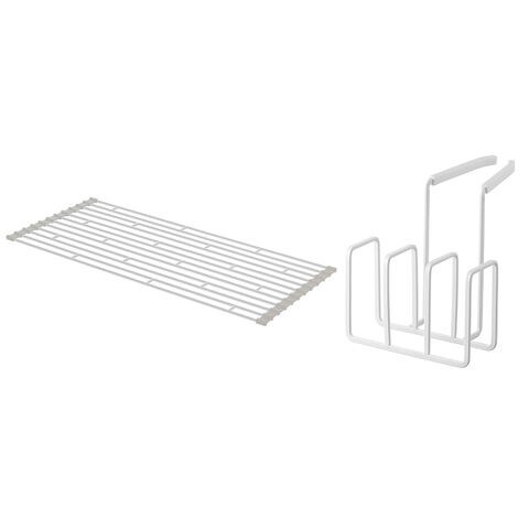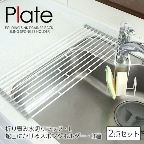 山崎実業 水切りラック プレート 水切り&スポンジラックセット ホワイト 折りたたみ 水切りラック・L & 蛇口にかけるスポンジホルダー・3連タイプ | 折りたたみ スポンジホルダー スポンジ置き シンプル