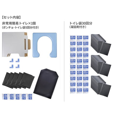 組立てカンタン簡易トイレと、凝固剤付きトイレ袋30回分のセット。