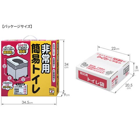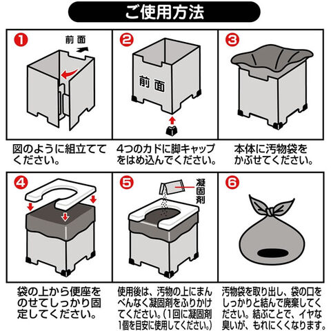 セット内容非常用簡易トイレ:便座×1個、本体×1個、補強パーツ×2個、凝固剤×5個、汚物袋(50×65cm)×5枚