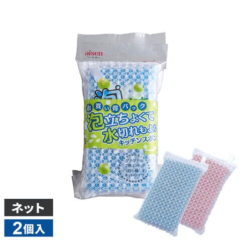 泡立ちがよく、水切れにすぐれたネットスポンジ 2個入。