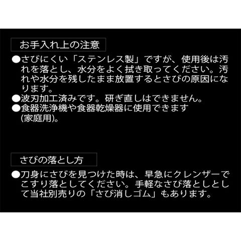 | 材質 | 刃体/ステンレス刃物鋼(刃付け形状/片刃付け) 柄/ナイロン(耐熱温度170度)、ポリプロピレン(耐熱温度110度) |