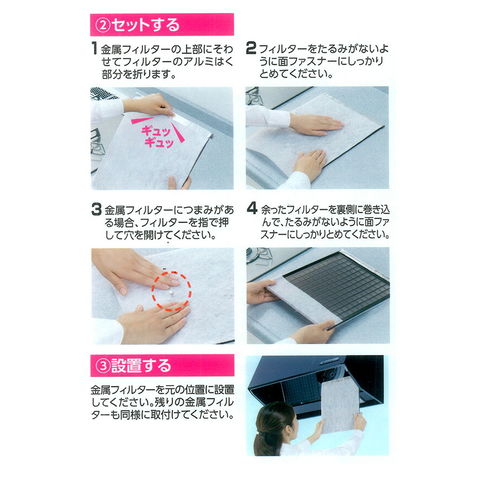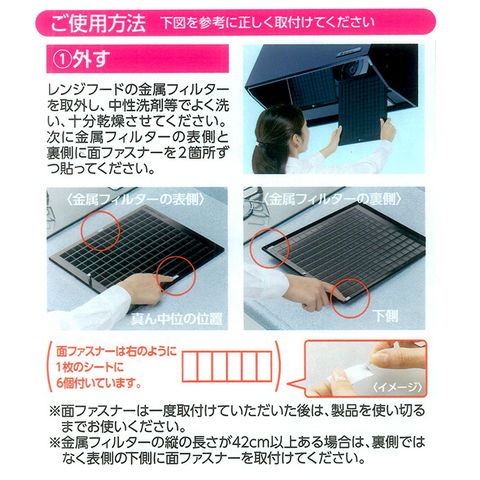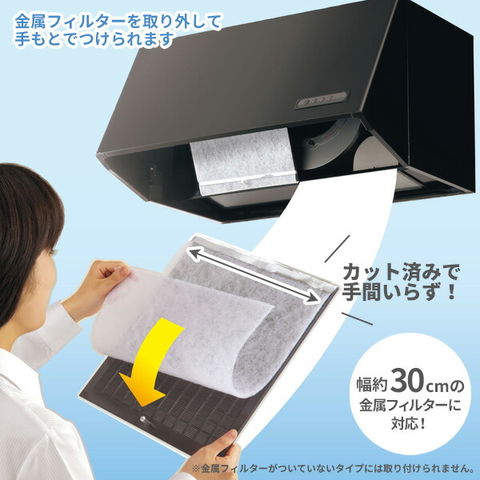 幅約29.5cmにカット済みのフィルターで金属フィルター1枚ずつに取り付けられます。