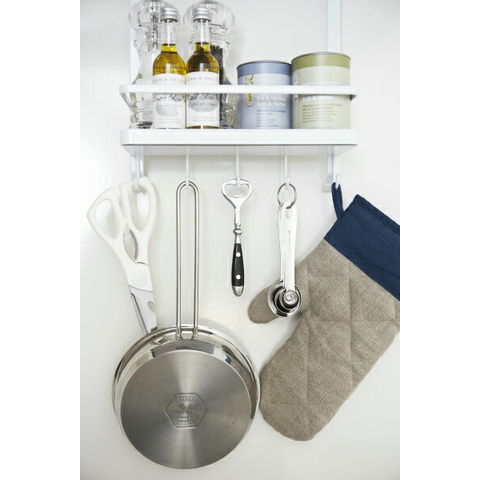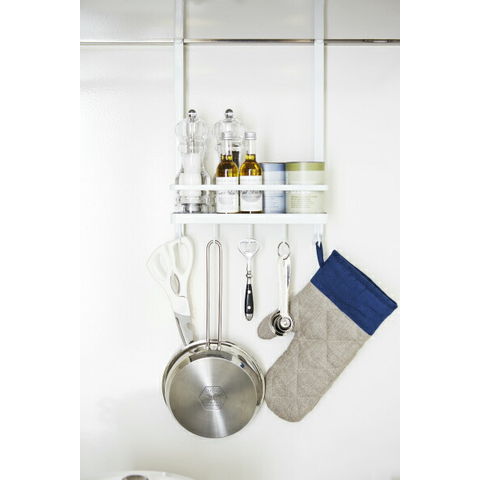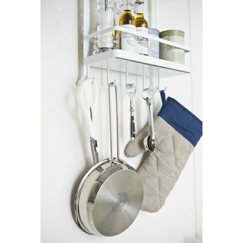 上のトレイには、スパイスや調味料などのボトルを、下のフックにはお玉やフライ返しなどの調理道具を収納できます。
