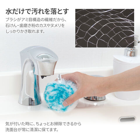 ブラシがアミ目構造の繊維になっているから、石けん・歯磨き粉のカスやヌメリをしっかりかき取れる。