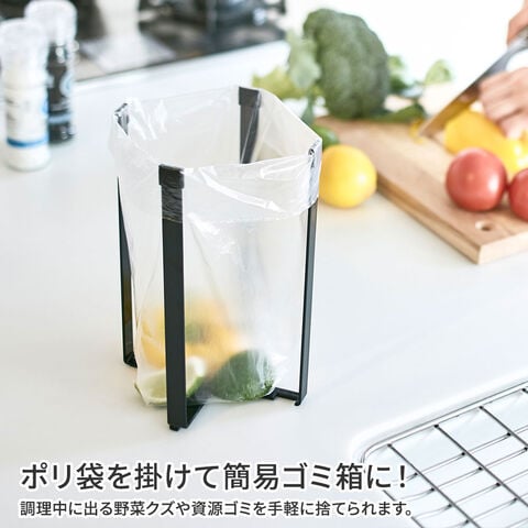 スーパーなどのポリ袋を掛けると簡易型ゴミ箱に。調理中に出る野菜クズや資源ゴミを、手軽に捨てることができます。