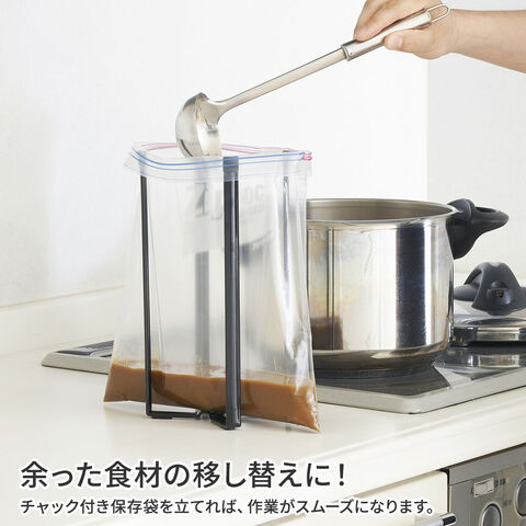 チャック付き保存袋を立てればあまった食材の移し替えがスムーズに。