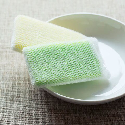 カラーはイエローとグリーン、泡立ちがよくやさしく洗えるネットスポンジ。