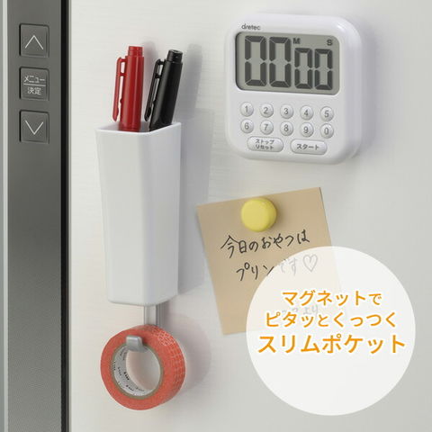 冷蔵庫やキッチンパネルなどにピタッとくっつく、スリムなマグネットポケット。