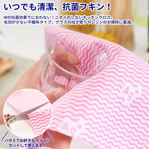 毛羽が少ない不織布タイプ。グラスの拭き取りやレンジのお掃除に最適。