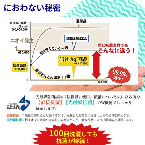 光触媒除菌繊維「銀世界」使用。繊維についた気になる菌を、「直接抗菌」「光触媒抗菌」のW機能でしっかり抗菌します。
