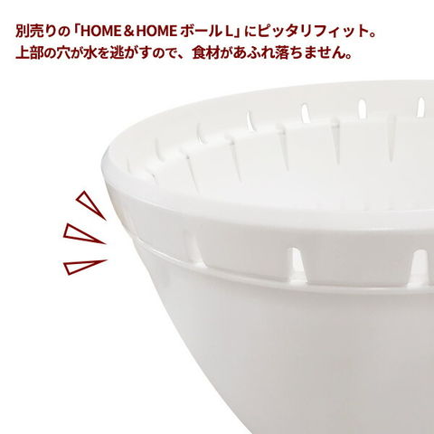 同シリーズのボールにピッタリ別売りの「HOME&HOME ボール L」にぴったりフィット。食材を洗う時など、上部の穴が水を逃がして食材があふれ落ちるのを防ぎます。