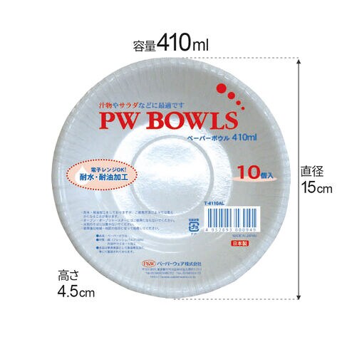 使い捨て 紙皿 PWボウル 410ml 10個入り T-4110AL | 使い捨て容器 紙ボウル 耐水 耐油 レンジOK 日本製 食器 焼肉 たれ皿 ペーパー皿 BBQ キャンプ アウトドア レジャー 行楽 スープ 汁