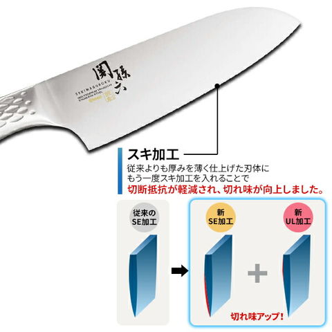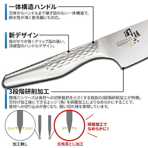 食材への切断抵抗を小さくする「スキ加工」と「三段階研削加工」により、食材への切り込みが良く、鋭い切れ味を味わえます。