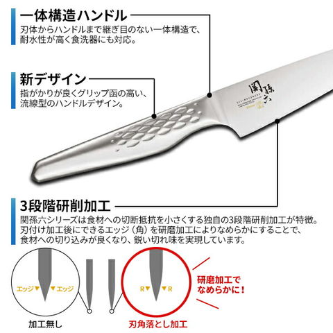 食材への切断抵抗を小さくする「三段階研削加工」により、食材への切り込みが良く、鋭い切れ味を味わえます。