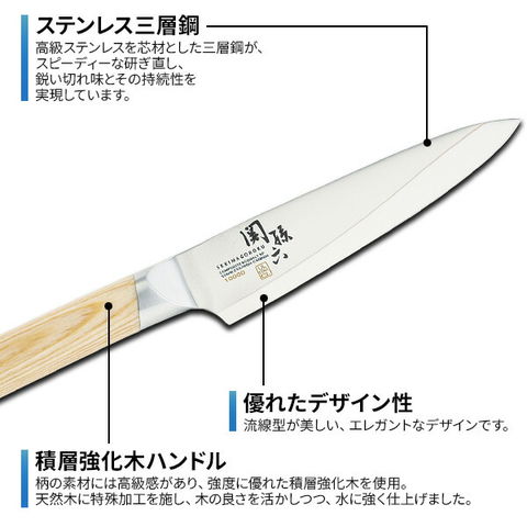 関連キーワード: made in japan japanese hocho kitchen knife knives sekimagoroku kaijirushi stainless high carbon stainless double edged japaneseknife petty knife chef's knife 万能包丁 小三徳 飾り切り 小さい 皮むき 野菜 下ごしらえ 卓上 じゃがいも サブ包丁 刃物 シェフナイフ 小ぶり 握りやすい 持ちやすい 手が小さい 衛生的 清潔 研ぐ デザイン おしゃれ ナチュラル 木柄 波紋 軽い 人気 本格刃付け 中級者 女性用 ギフト 母の日 プレゼント 誕生日 贈り物 モダン 国産 4901601364040