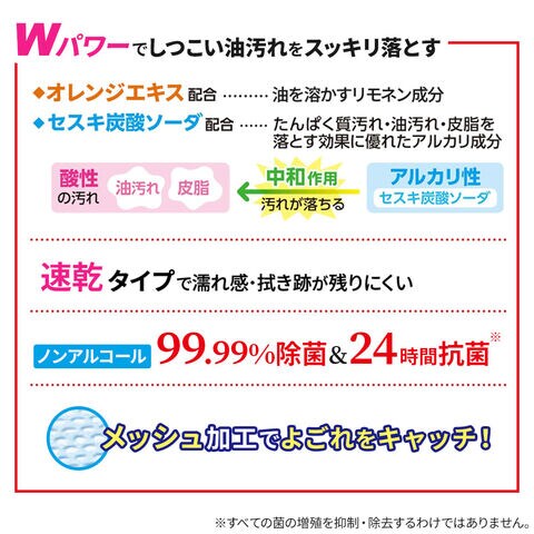 Wパワーでしつこい油汚れをスッキリ落とす油を溶かすリモネン成分、オレンジエキス配合。