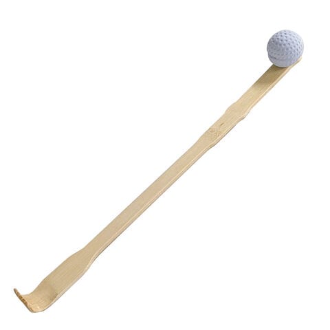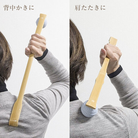 肩たたきなどもできるゴムボールが付いた、昔ながらの竹製孫の手。