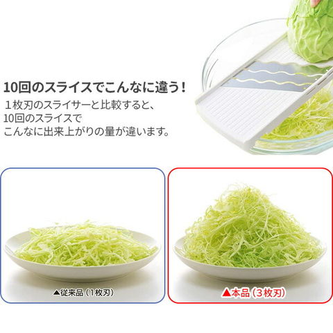 1度で3枚にスライスできるので、調理の手間を大幅に短縮することができ、特に手間のかかるキャベツの千切りに威力を発揮します。