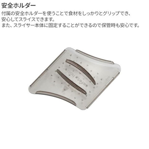 手指をガードする安全ホルダーつき透明で食材が見えやすく、鋭利な△形のリブで、食材をしっかりとグリップします。また、本体に固定することができるので、保管時の刃の安全カバーとしても機能を果たします。