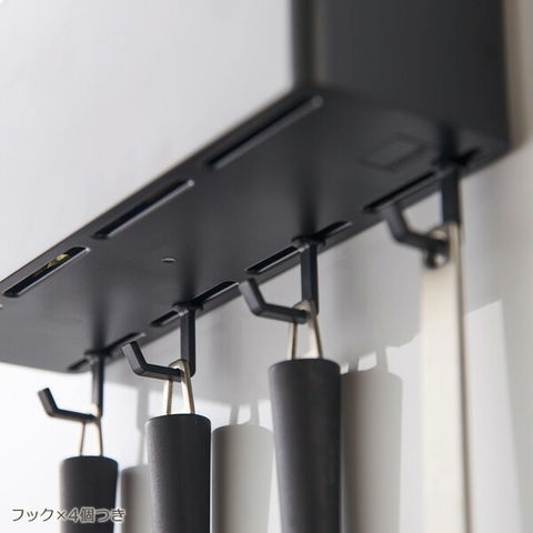 フック付きフックが4個あり、キッチン小物が吊り下げ収納できます。