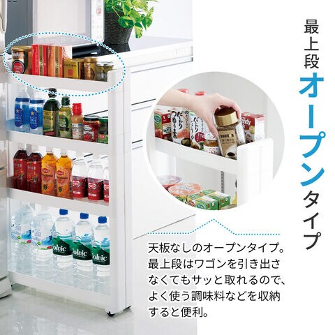 オープンタイプ天板なしのオープンタイプ。最上段はワゴンを引き出すことなくサッと取れるので、よく使う調味料などを収納すると〇。