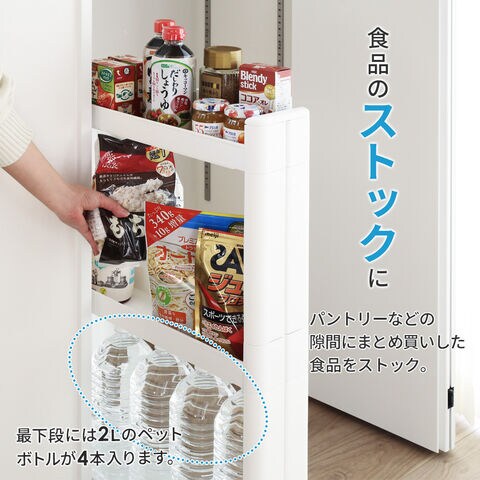 調味料やボトル類のストックに調味料や小物の収納、缶詰め・ビン詰めなど食品のストック、ペットボトルの収納も。