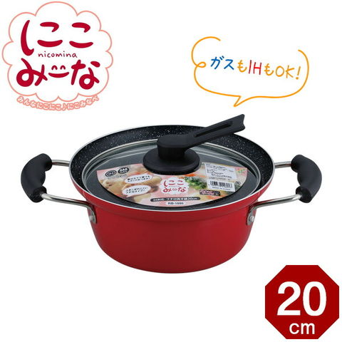 IH対応 両手鍋 にこみーな 20cm RB-1695 | ふきこぼれにくい 鍋 フチ付き フッ素加工 クイックマーブル こびりつきにくい フタが立つ ガラス蓋付き ふきこぼれ防止 鍋 フッ素樹脂 金属ヘラ対応 ガス火 IH 両手なべ