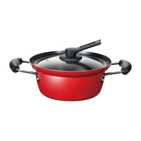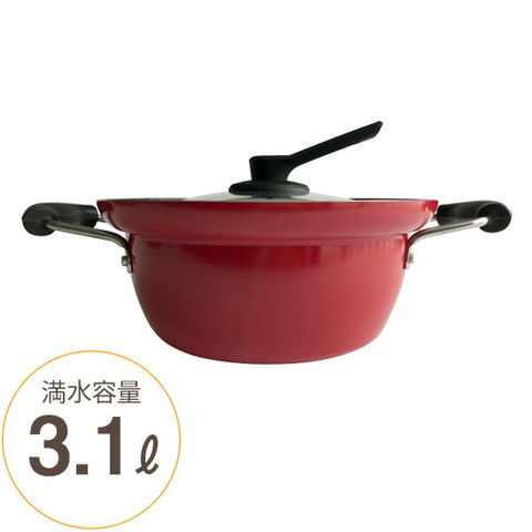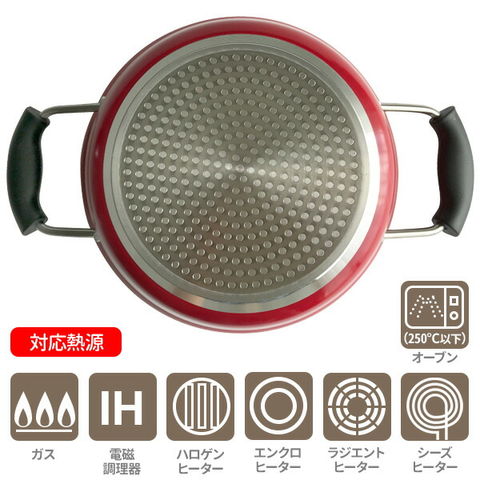 | 材質 | 本体/アルミニウム合金 内面/ふっ素樹脂加工(ダイキン/クイックマーブルEL) 外面/焼付塗装 はり底/ステンレス鋼(底の厚さ2.8mm) ガラス蓋/強化ガラス |