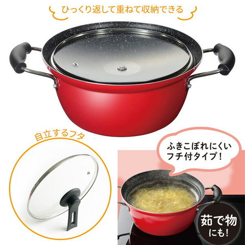 ふきこぼれにくく、こびりつきにくく、フタの置き場所に困らない!実用的なIH対応両手鍋。
