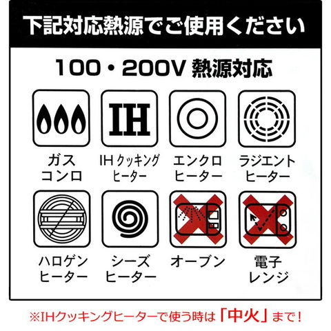 IHクッキングヒーターでご使用になる場合は、必ず「中火以下」で使用してください。強火力でのご使用は本体変形及び器具の破損の原因になります。