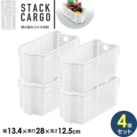 収納ケース スタックカーゴ スリムミニ 深型 幅13.4×奥行28×高さ12.5cm ホワイト ×4個セット F2529 | プラスチック 収納カゴ かご 白 バスケット 積み重ね スタッキング 整理 深い