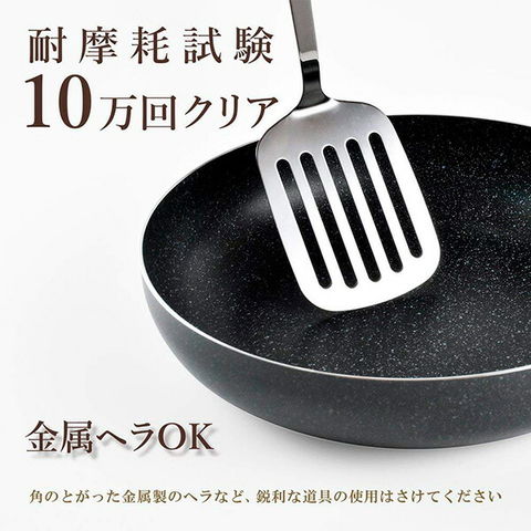 耐摩耗性に優れたコーティングで丈夫なので金属ヘラもお使いいただけます。(鋭利な道具の使用は避けてください。)