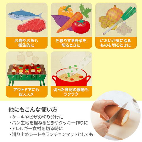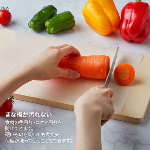 まな板の上に敷いて食材の色移り・ニオイ移りを防止できる、まな板シートです。