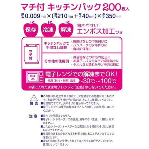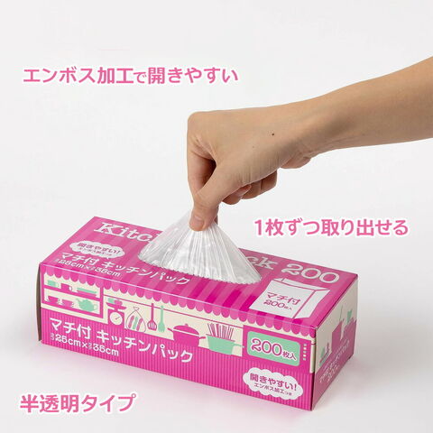キッチン用 ポリ袋 マチ付 キッチンパック 半透明 200枚×3個入 PC-200M-3 | 食品保存 袋 調理 冷凍 箱入り まち付き 600枚 大容量 耐熱100℃ レンジ 解凍 ポップアップ 一枚づつ取れる 食材保存 小分け