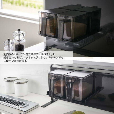 マグネットがつく壁面に取り付けられるマグネットキッチンシリーズの調味料ストッカーラック。