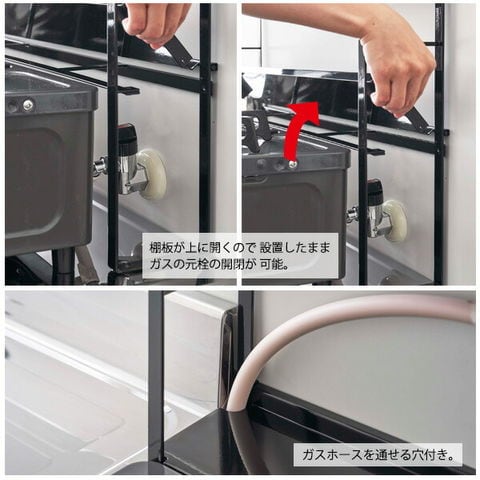 棚板が上に開くので、設置したままガスの元栓の開閉が可能です。