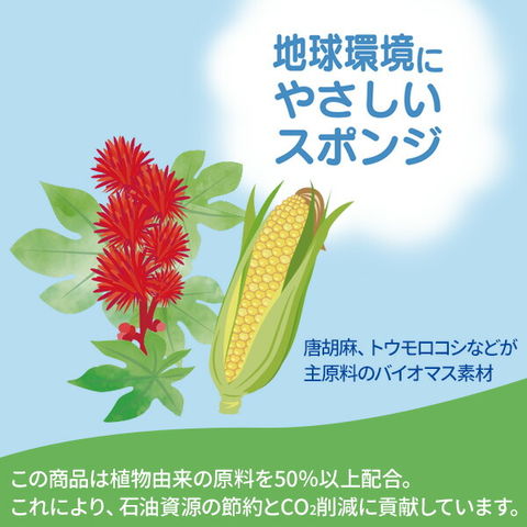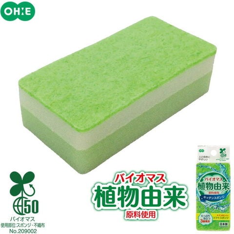 スポンジと不織布にバイオマス原料(生物由来の資源)を使用したキッチンスポンジ。