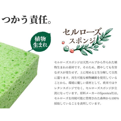 植物生まれの天然素材であるセルローズを使用した、地球にやさしい食器洗いスポンジ。