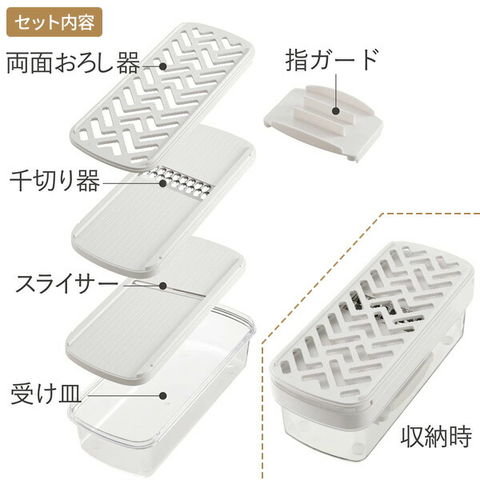 1台4役の調理器セット。両面おろし器・スライサー・千切り器・受皿・指ガードが付いて、コンパクトに一つにまとまります。