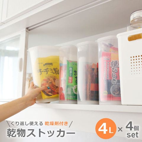乾物ストッカー 4L ナチュラル ×4個セット 1214 | 保存容器 食品保存 保存ケース 縦型 袋のまま 湿気ない 透明ケース 立てる 乾燥剤付き スリム 中身が見える パントリー収納 密閉 乾物
