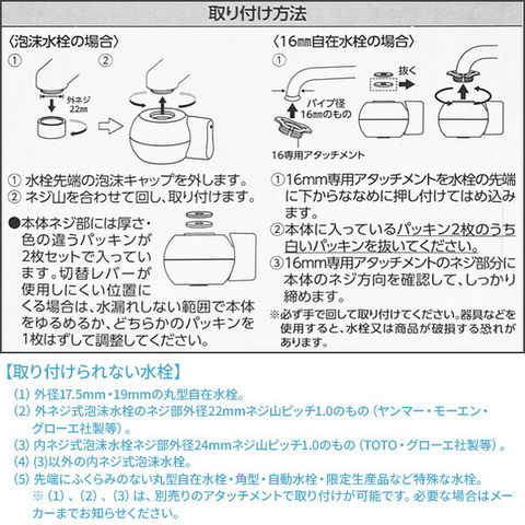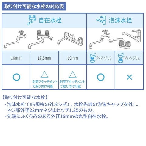 取り付けがラク!泡沫水栓のネジ部分にはめるだけ!16mm丸型自在水栓にも、アタッチメント使用で固定が可能。