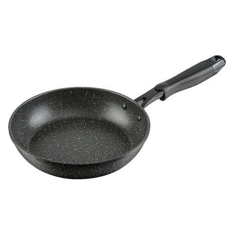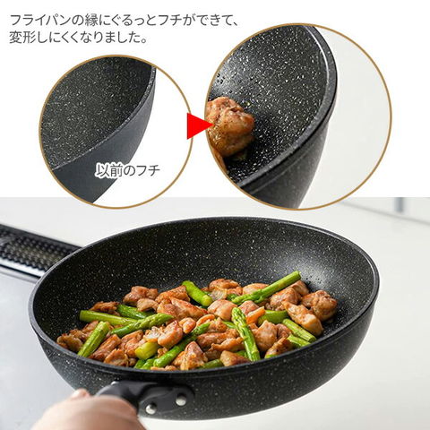 使い勝手がいい2種類のマーブルを使用した強くてなめらかなフライパンなので、こびりつかずお手入れラクラク。 金属ヘラも使用できます。