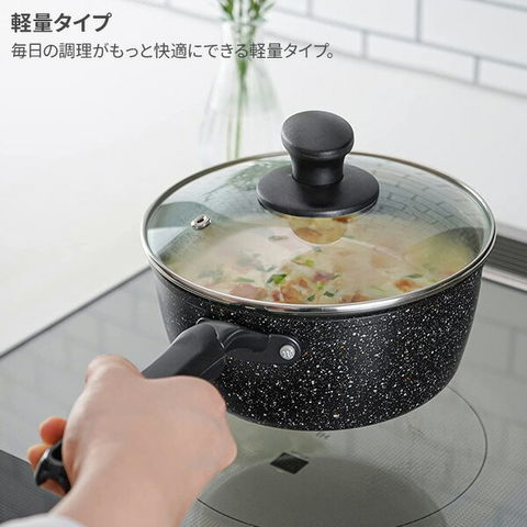 こびり付きにくく、耐摩耗性に優れた「ダブルマーブルコーティング」のふっ素樹脂加工の片手鍋。